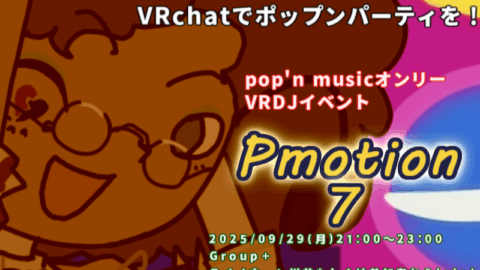 VRchatでポップンパーティを! pop'n music楽曲オンリーVRDJイベント Pmotion7 9⁄29(月)21˸00~23˸00 Group+ ライノホーン川井もしくは参加者、グループからjoin プレイステーション2で初登場!の7回目です!ポップン好きな人のjoin待ってます!
